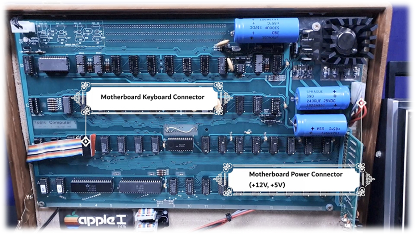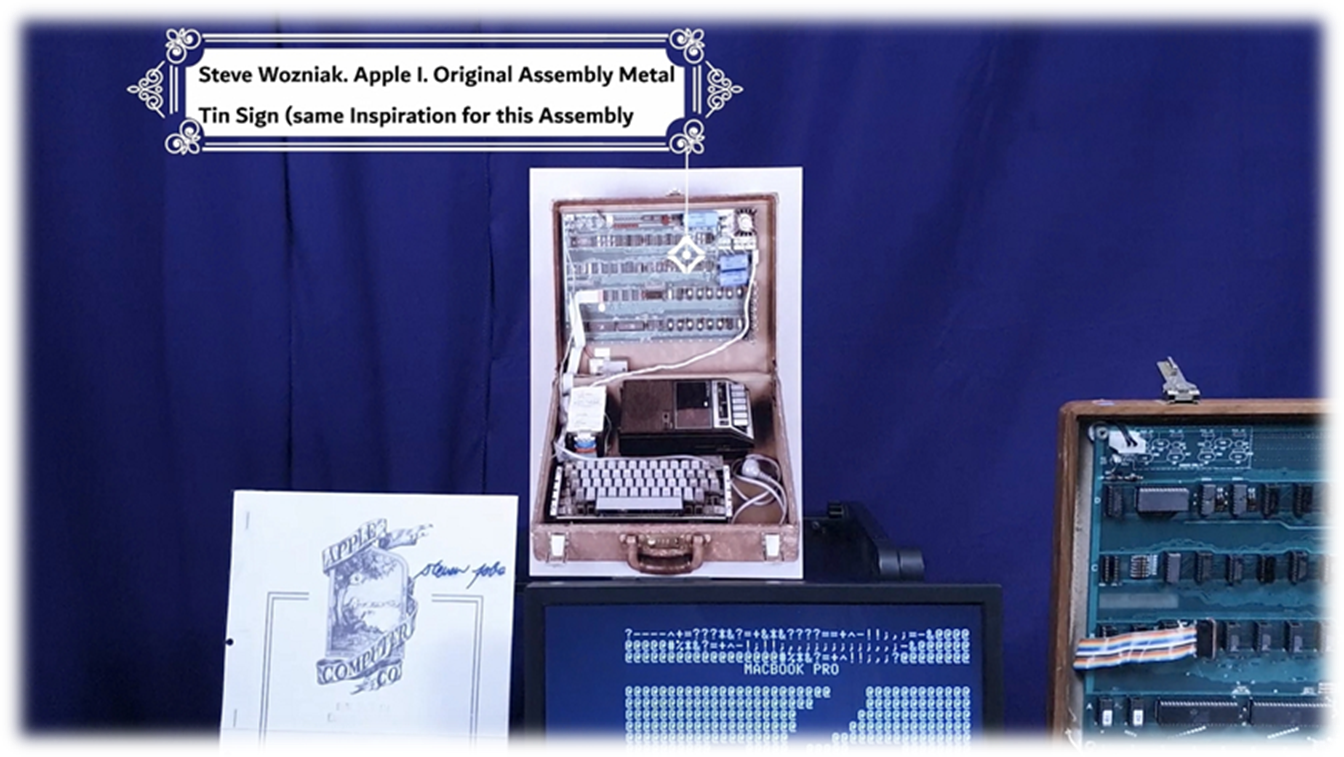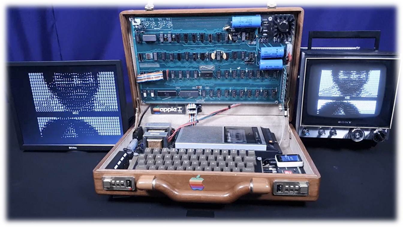 · On Startup: blinking @ signs filling screen · Press ClearScreen black button integrated left of the case · Press RESET key to start commands · C100R : to enter cassette load/save mode · 280.FFFR : then press cassette tape to load demo text photos program · RESET : any time to break run · Load software from default cassette tape player or switch cassette IN cable to integrated media player with 100s of Apple 1 applications and games · Keep cassette player volume level low (3-4) and Tone (7-8) for better program loading and recognition (analog to digital conversion) |