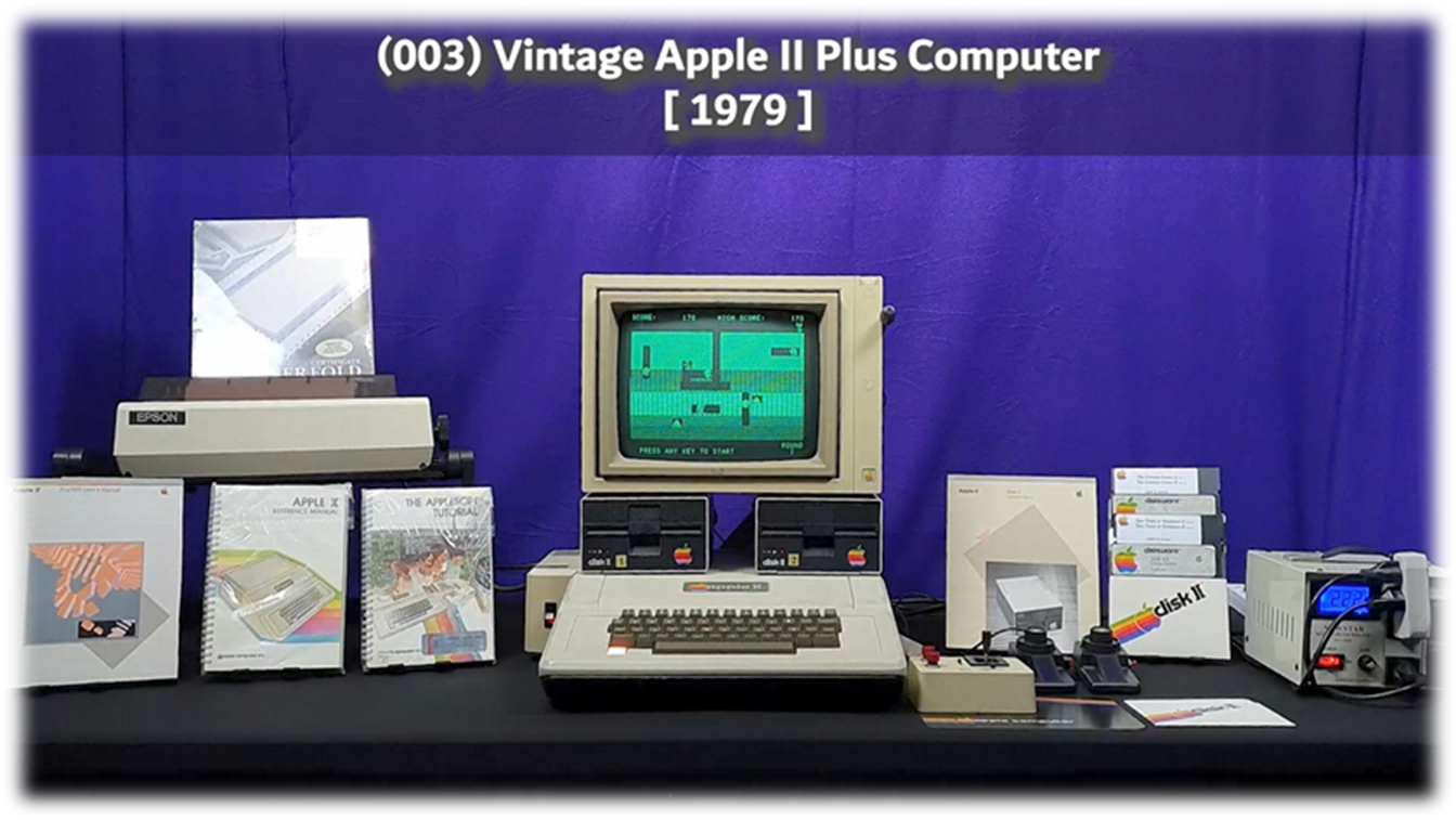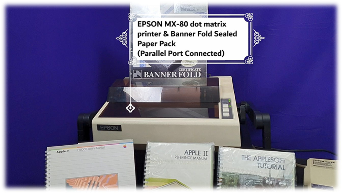 · 2 buttons Joystick + 2 Pedals · EPSON MX-80 dot matrix printer & Banner Fold Sealed Paper Pack · Apple Computer Metal Banner · Original Apple II Manuals: · Apple II Reference Manual with Foldout Schematic · The Applesoft Tutorial Manual & Errata · ProDos User’s Manual · Disk II Reference Manual · Apple II Bootable Disks Bundle (Diskware DOS 3.3, Tass Times in Tonetown Game, The Crimson Crown Game, DigDog Game) |