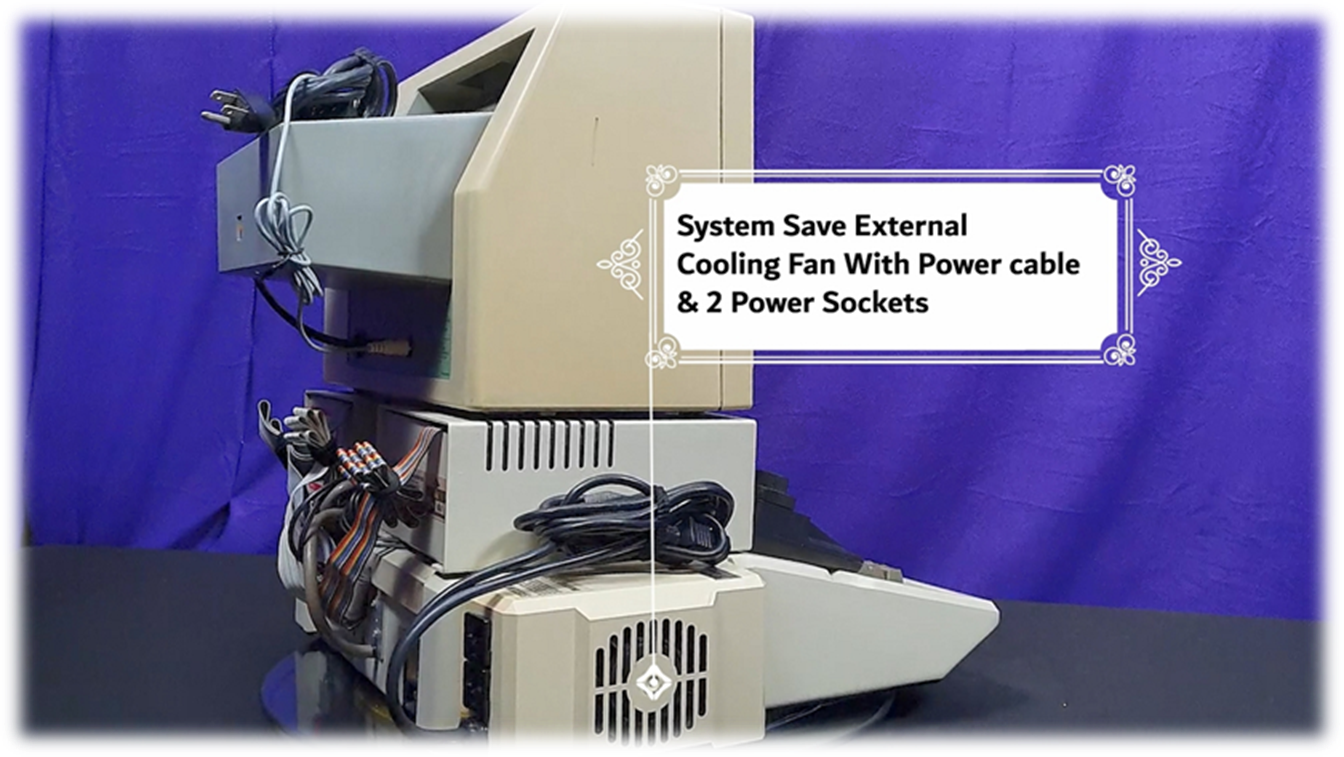 · Floppy disk controller card (A+B) · EPSON parallel I/O printer card · Dual joystick support adapter (manual switch) · System Save External Cooling Fan: With Power cable extension for computer, 2 extra power sockets for monitor and others printer |