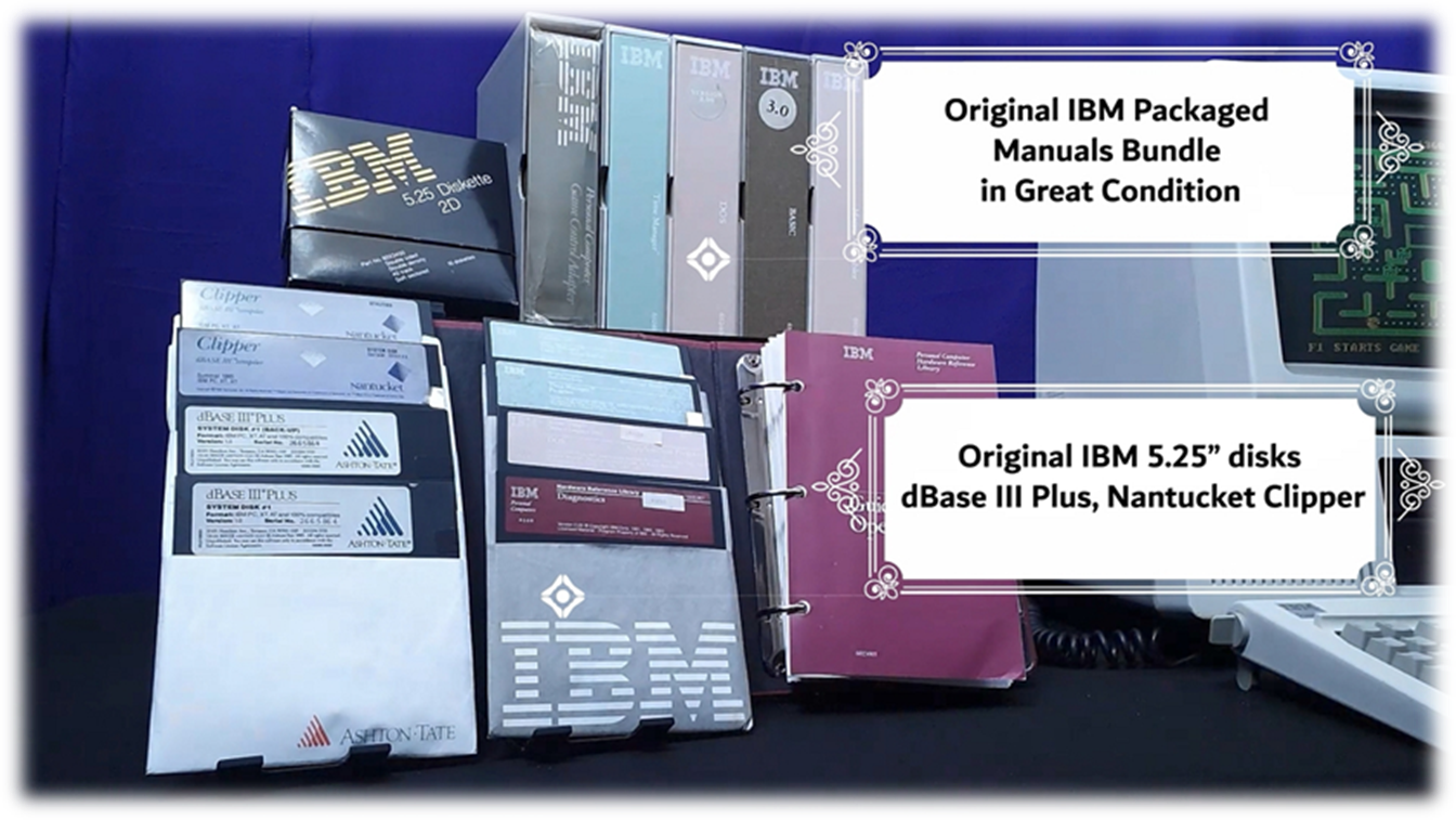 · Original IBM Packaged Manuals Bundle: · BASIC v3.0 software and Manuals · DOS v2.0 software and Manuals · Micro Assembler software and Manuals · Guide to Operations Manuals · Time Management Software · SunCom Analog Plus IBM XT Joystick · 5.25” Floppy Disk Bundle: · Original dBase III Plus System (8 Disks) · Original Nantucket Clipper dBase III Compiler – Summer 1985 (6 Disks) |