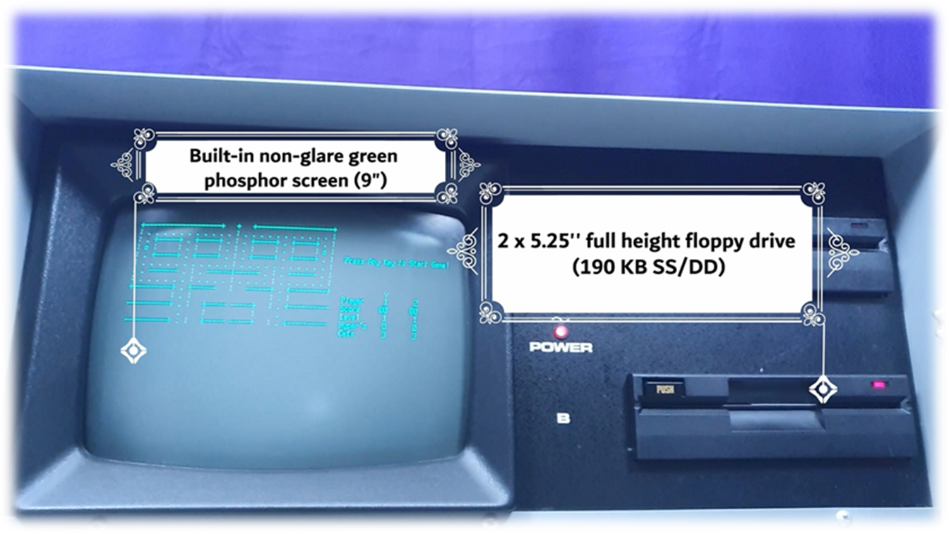 · Built-in non-glare green phosphor screen (9") · Text: 80 x 25 · Graphics: 640x400 |