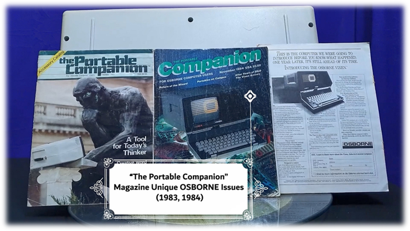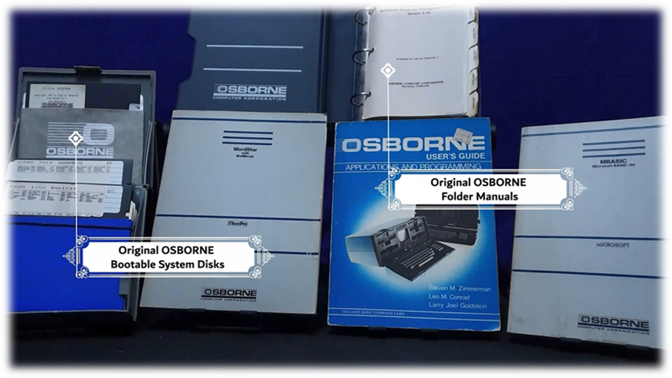 · Set of system diskettes and Games · Original Companion Magazines (FEB 1983, NOV 1984) · Original Osborne 1 user’s guide and diskettes · Original Osborne 1 Applications and Programming · Original Osborne 1 Reference Manuals |