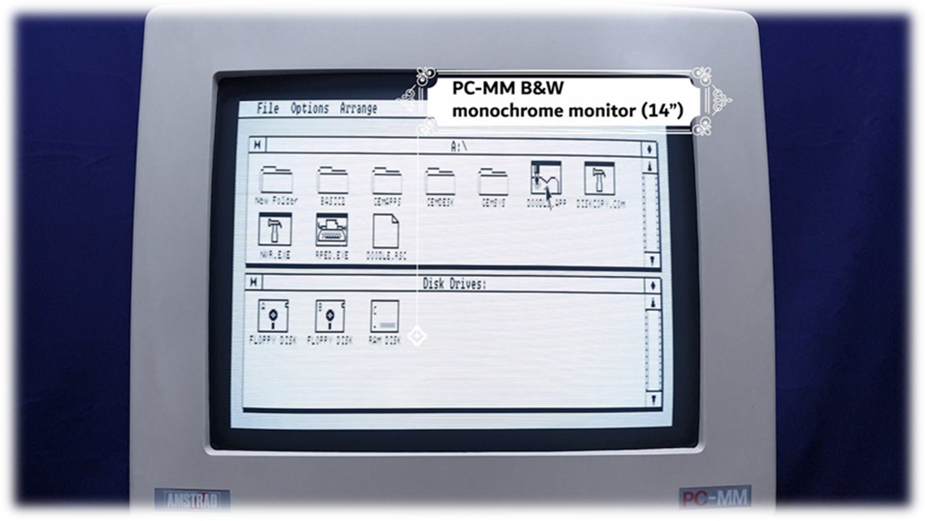 · PC-MM B&W monochrome monitor (14") · Text: 80 x 25 · Graphics: 640 x 200 |