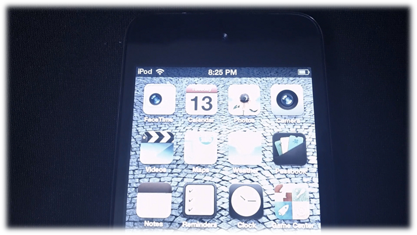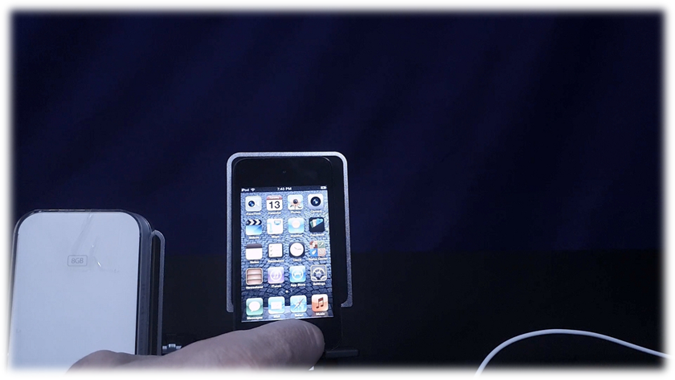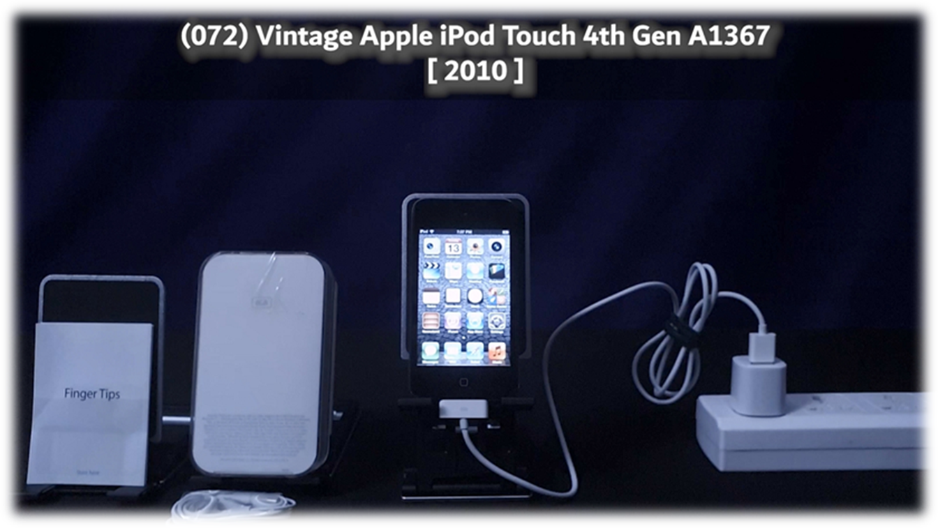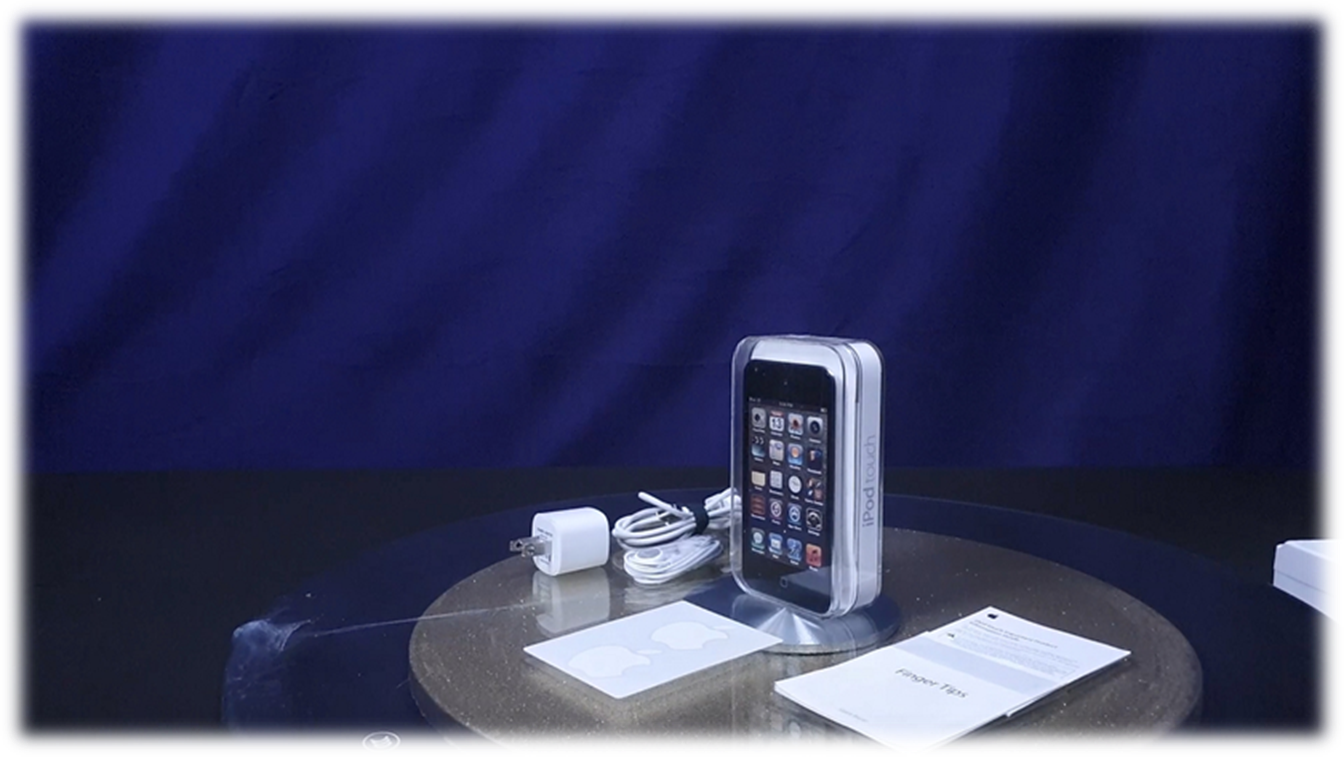 · AC Adapter · Charging/Syncing Cable · Headset · Original Glass Box · College Wooden Frame of Real iPod Touch Components |