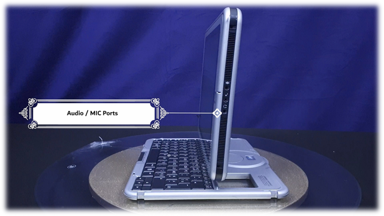 · 2 x USB v2.0 ports · External VGA monitor port · PCMCIA Expansion Card Slot · InfraRed port · SD Card port · Audio input ports 2.5 mm (IN, OUT, MIC) |
