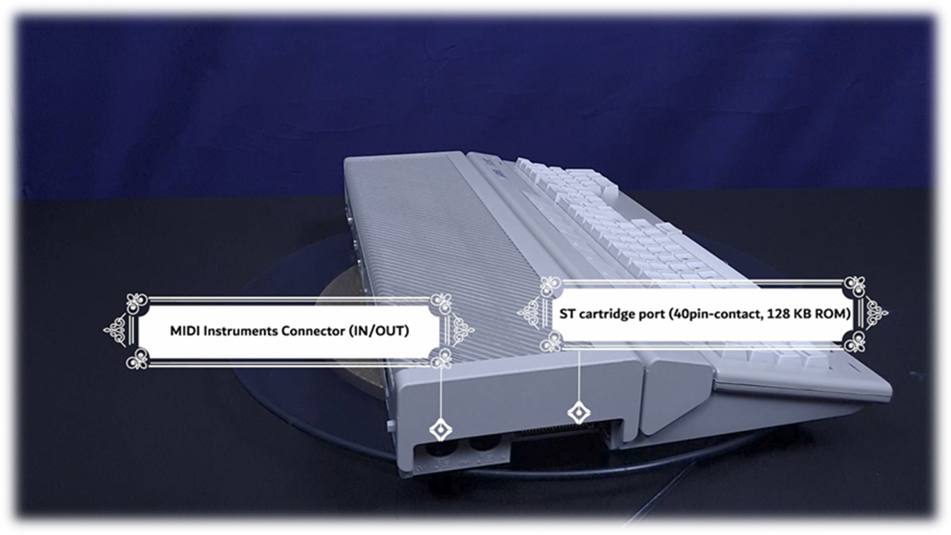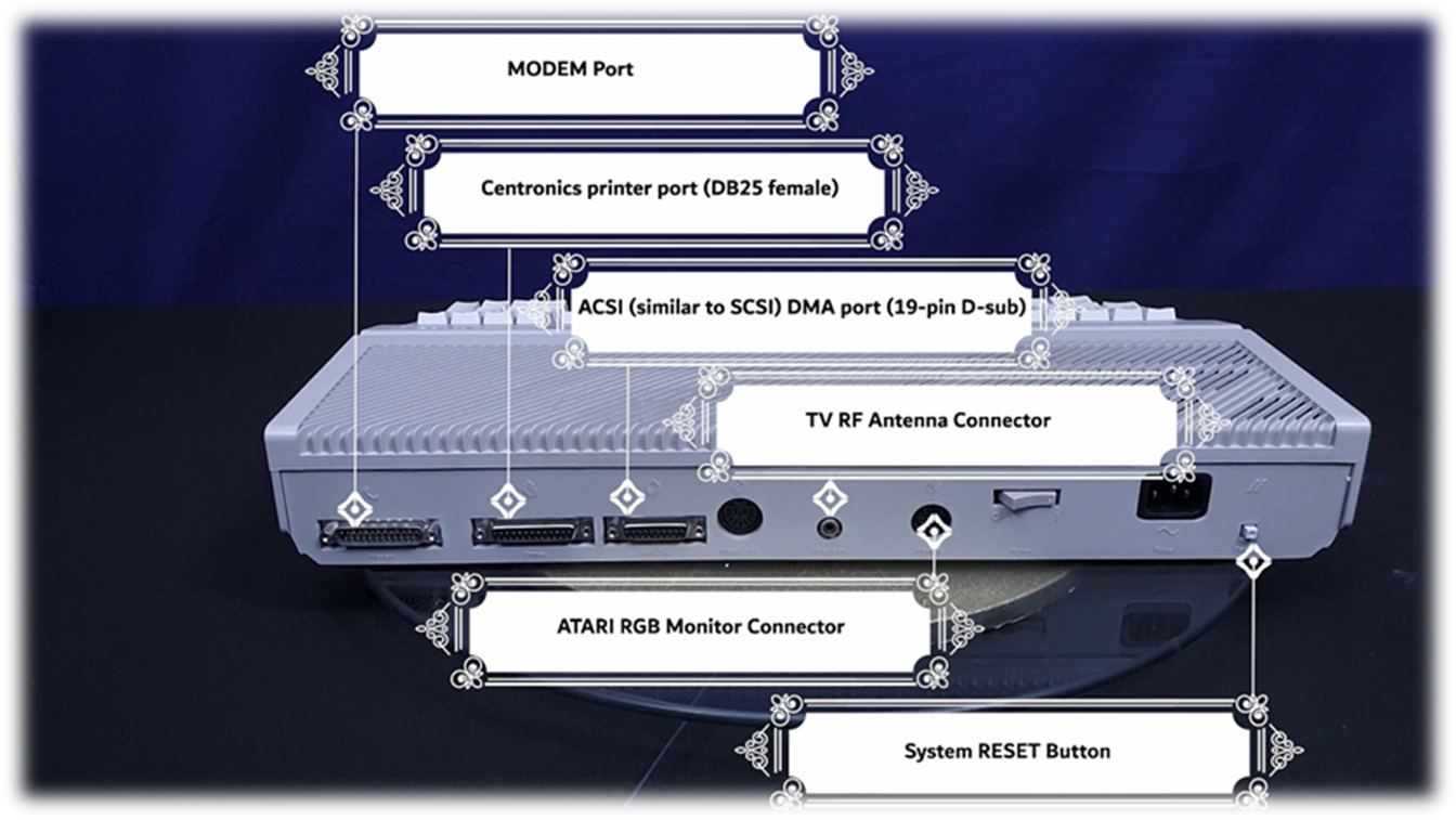 · RS-232c serial port (DB25 male) · Centronics printer port (DB25 female) · Atari joystick/mouse ports (DE-9 male) · 2 MIDI ports (5-pin DIN, "IN" and "OUT") · Monitor port (custom 13-pin DIN) · ACSI (similar to SCSI) DMA port (19-pin D-sub) · Floppy port (14-pin DIN) |