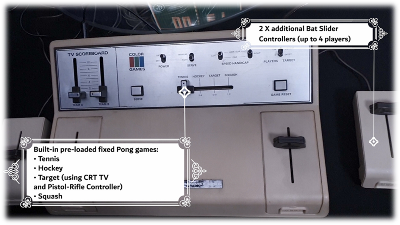 Built-in pre-loaded fixed Pong games: · Tennis · Hockey · Target (using CRT TV and Pistol-Rifle Controller) · Squash |