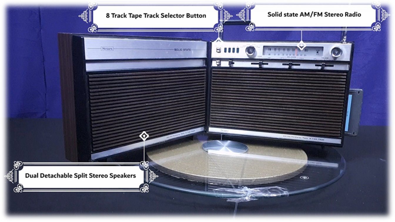 · Solid state AM/FM Stereo Radio · 8 Track Player Model 250 · Split speaker feature · AC/DC power |