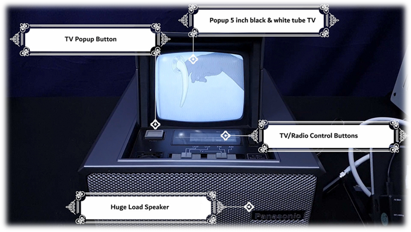 · Popup 5 inch black & white tube TV · Built-in VHF/UHF/FM Rod Antenna · Retractable Carrying Handle · TV/Radio Tuning · Contrast, Brightness, Vertical Hold Controls |
