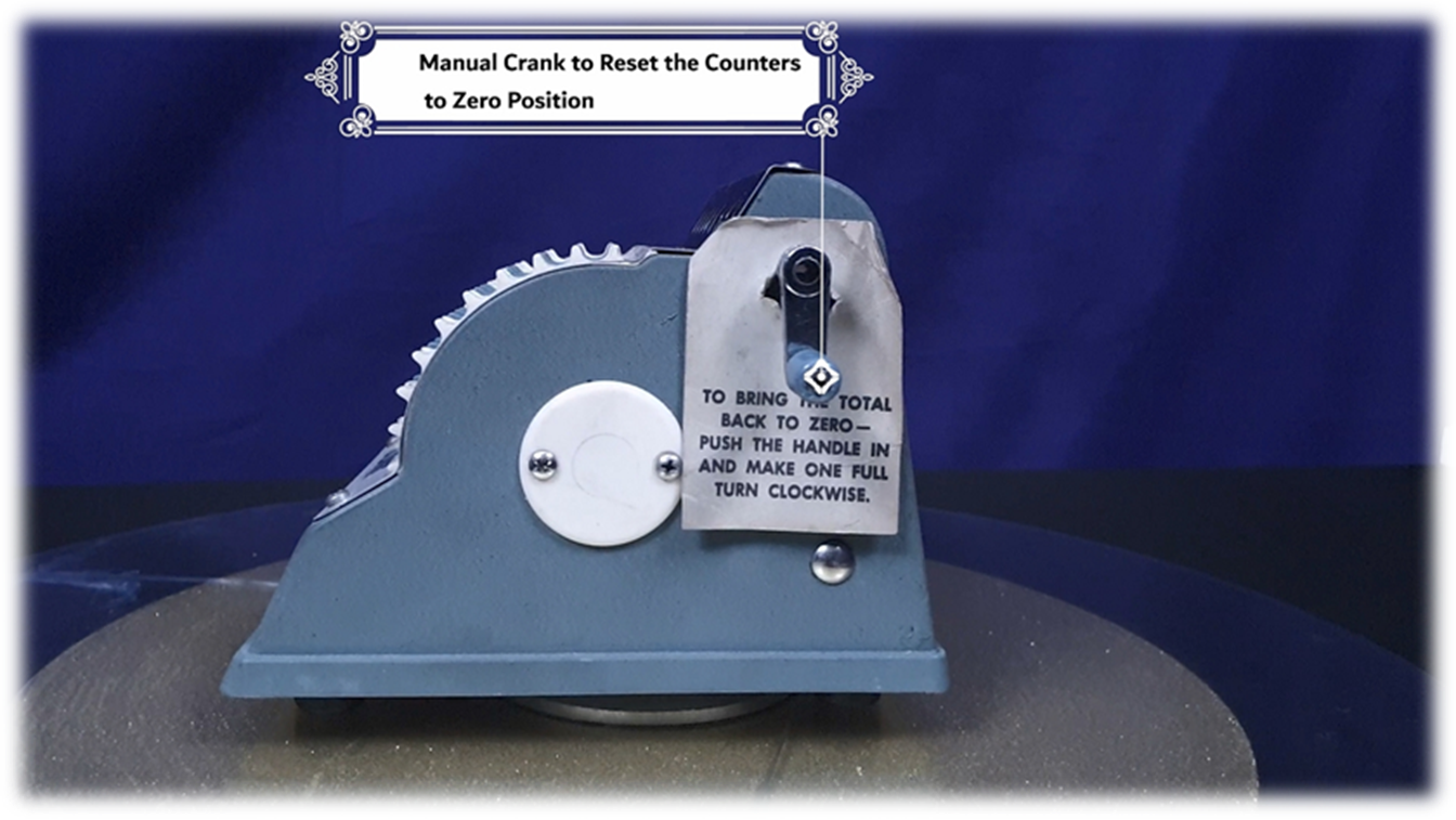 · Made by the Pearl Engraving Co., New York · Simply turn the plastic gears to the desired number at each spot · Turn the crank to turn it all to zero again · Size: 5 1/2" tall x 4 9/16" wide · Vintage green metal enigma cypher machine |