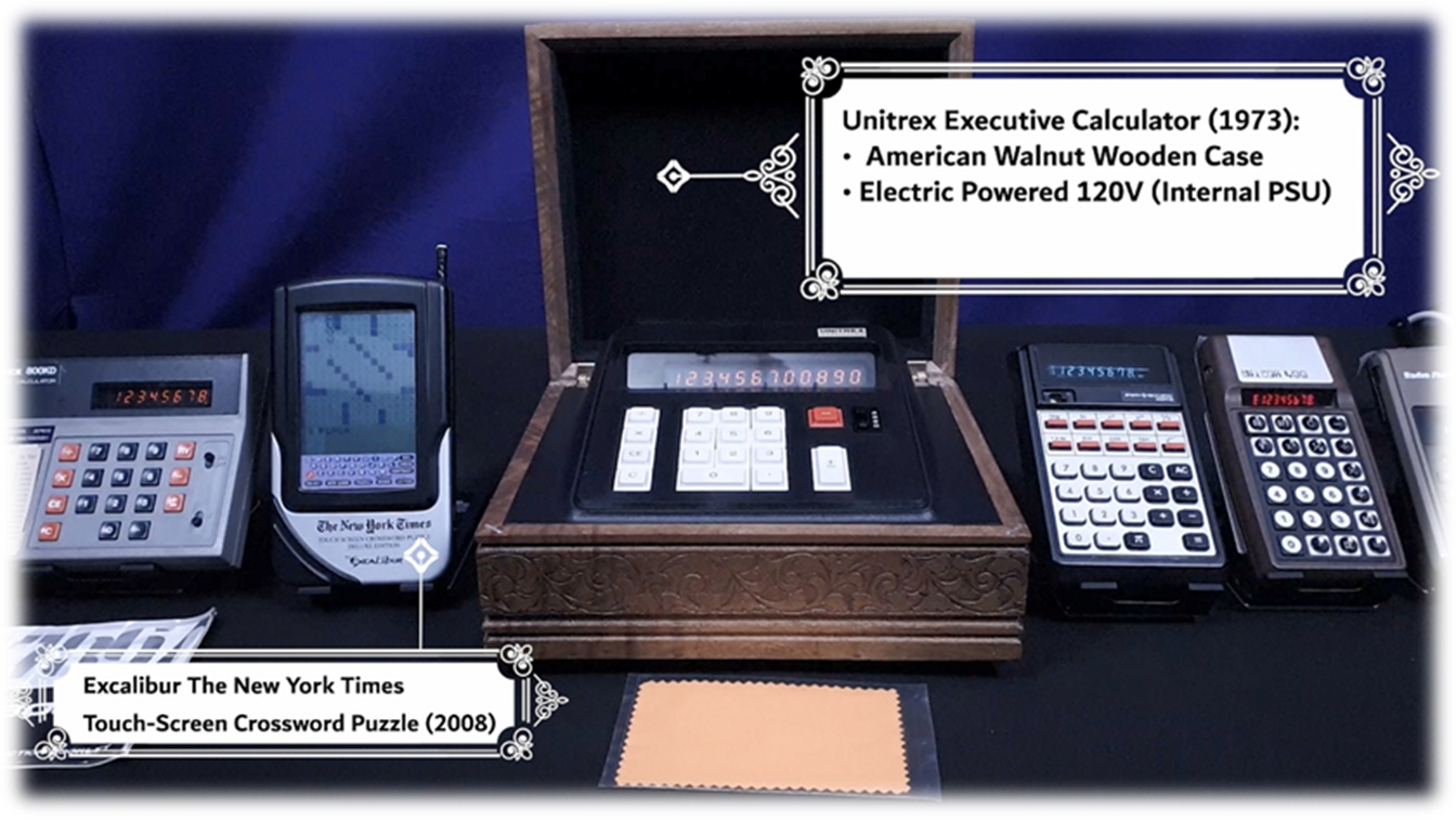 120V Only (Internal PSU) · Unitrex 800KD Electronic Calculator (1973): · Instructions Booklet · Excalibur The New York Times Touch-Screen Crossword Puzzle (2008) · Melcor 400 Electronic Calculator (1973) · Radio Shack EC-380 Calculator (1977) · Sperry Remington SSR-8 Calculator (1974) · Franklin CW-50 Crosswords Puzzle Solver (Merriam Webster) (1992): · User’s Manual · Franklin Electronic Library · Product Registration Card · Sealed Cleaning Fabric · Soft Leather Carrying Case |