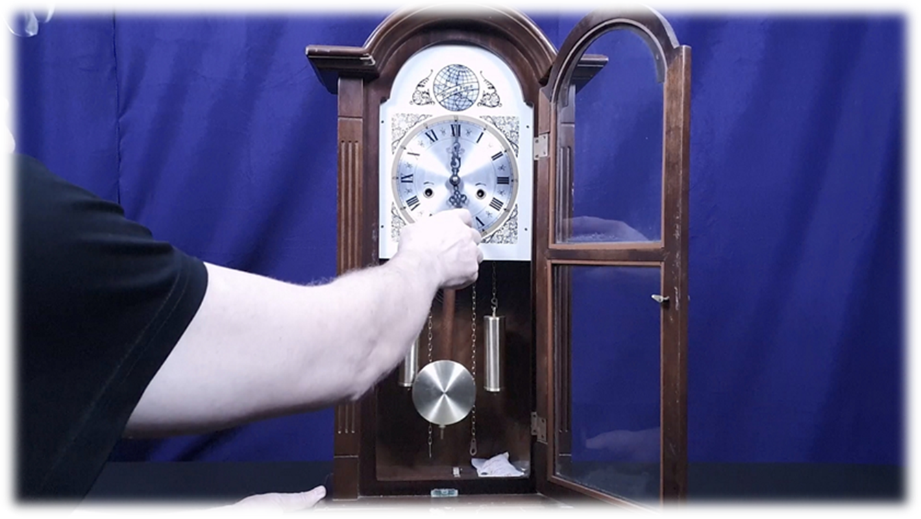 · Beautifully Crafted Wood Grain Casing · Metal Ornate Face with Roman Numerals · 2 X Hollow Display Weights on chains · 31 X day movement & is spring-driven · 2 X Winding Arbors on the Dial · Coil Spring Hammer Gong Which Strikes Once on the half-hour · Adjustable Pendulum plus Key · Made in Korea · 27 1/2" tall x 15" wide x 5 1/4" deep |